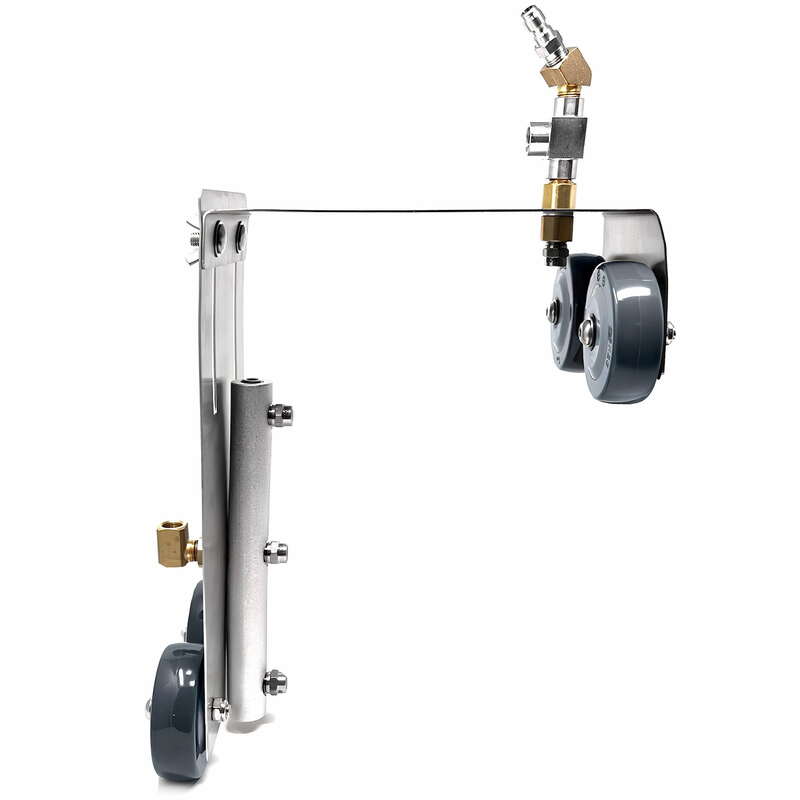 Its four poly wheels provide smooth mobility, and the adjustable height from 5" to 9" allows for versatile cleaning across various curb sizes. The integrated 1/4" quick-connect nipple inlet ensures easy setup with standard pressure wash equipment, making this an ideal solution for municipal and commercial contractors who need precision and durability in the field.