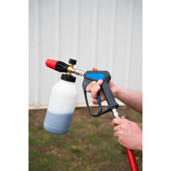 This foam cannon features a 2-liter wide mouth bottle and is equipped with an adjustable spray pattern, offering both horizontal and vertical settings. Designed for use with pressure washers, it delivers consistent foam output in demanding cleaning applications. The unit operates within a pressure range of 3000 to 4000 PSI and supports temperatures up to 140°F.
